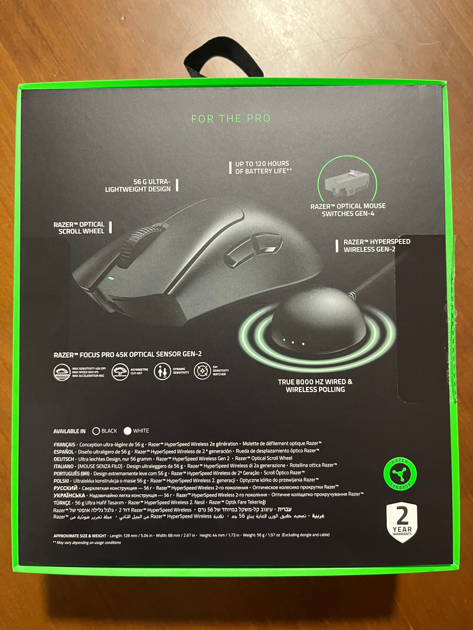 Sus dimensiones son de 128 x 68 x 44 mm y su peso es de tan solo 56 gramos (57 gramos en la White Edition), lo que supone aproximadamente un 10 % menos que el modelo anterior. Esto lo convierte en un ratón extremadamente ligero, ideal para realizar movimientos rápidos y precisos con menor fatiga.