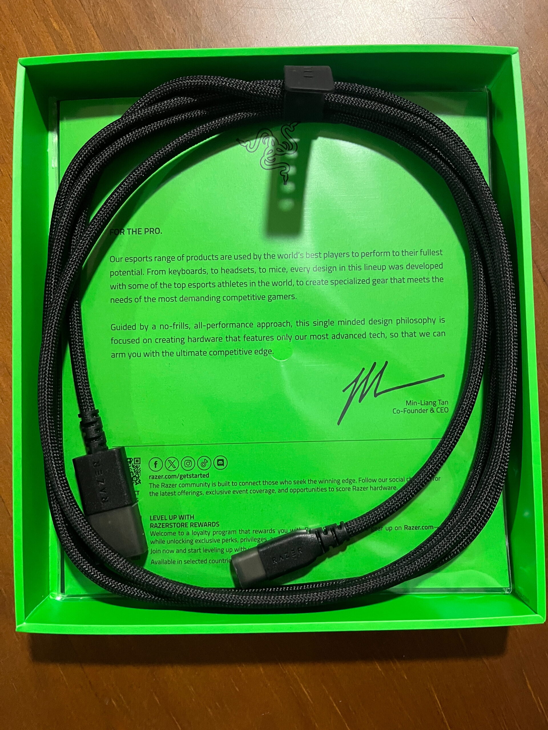 Junto al ratón encontramos el receptor inalámbrico y un cable USB-A a USB-C para carga y uso con cable. Como es habitual en los productos de Razer, también se incluyen un pequeño manual, una tarjeta de agradecimiento y varias pegatinas con el logo de la marca.