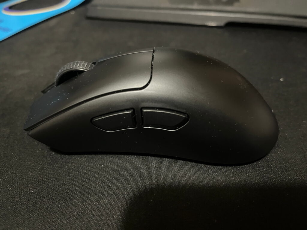 Una vez fuera de la caja, el DeathAdder V4 Pro mantiene la línea de diseño que hemos visto en generaciones anteriores. Se trata de un ratón diseñado para diestros, optimizado principalmente para agarre tipo palma, una posición cómoda que permite cubrir gran parte de la superficie del ratón y resulta natural para la mayoría de los usuarios.
