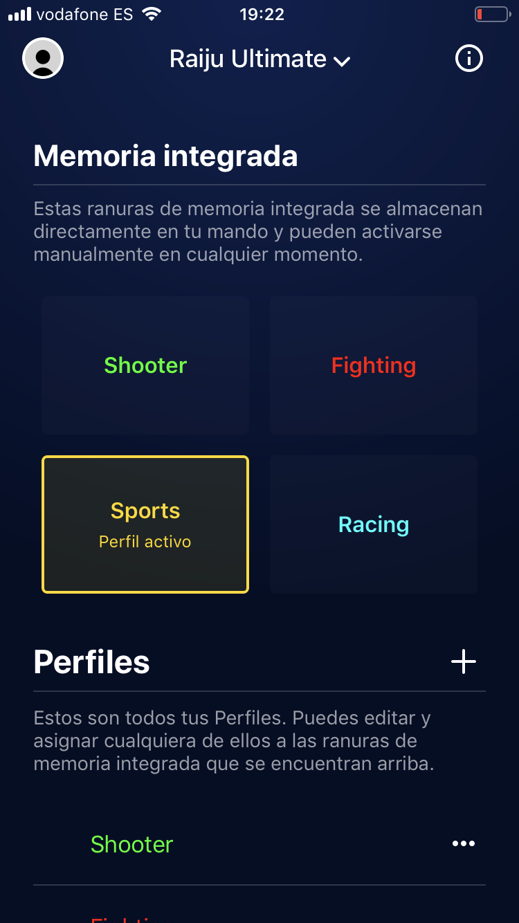 Lo primero que hacemos es enlazar el mando con nuestra aplicación, una vez vinculado tendremos que elegir entre cuatro perfiles (los predeterminados, aunque podemos crear multitud de perfiles personalizados con distintas configuraciones y que se guardan en la memoria del mando).
