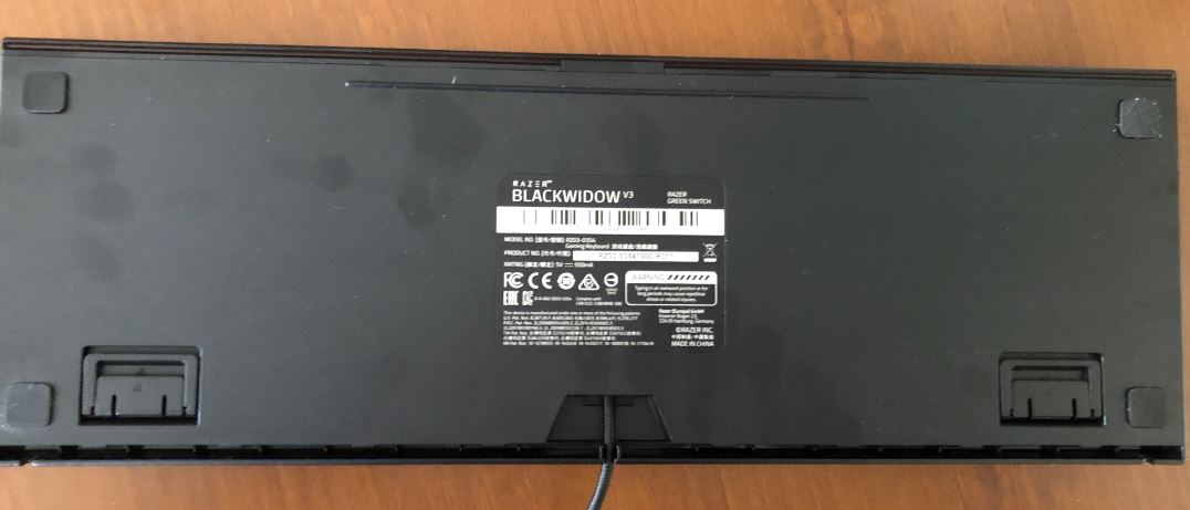 La parte trasera del Razer BlackWidow V3 cuenta con cuatro patas con goma antideslizante y dos pequeñas patas elevadoras con dos alturas. El cable USB sale de la parte superior y nos permite guiar el cable desde el centro o si lo preferimos podemos introducirlo por las guías y que salga por uno de los extremos (esto ya depende de lo que prefiera el usuario).