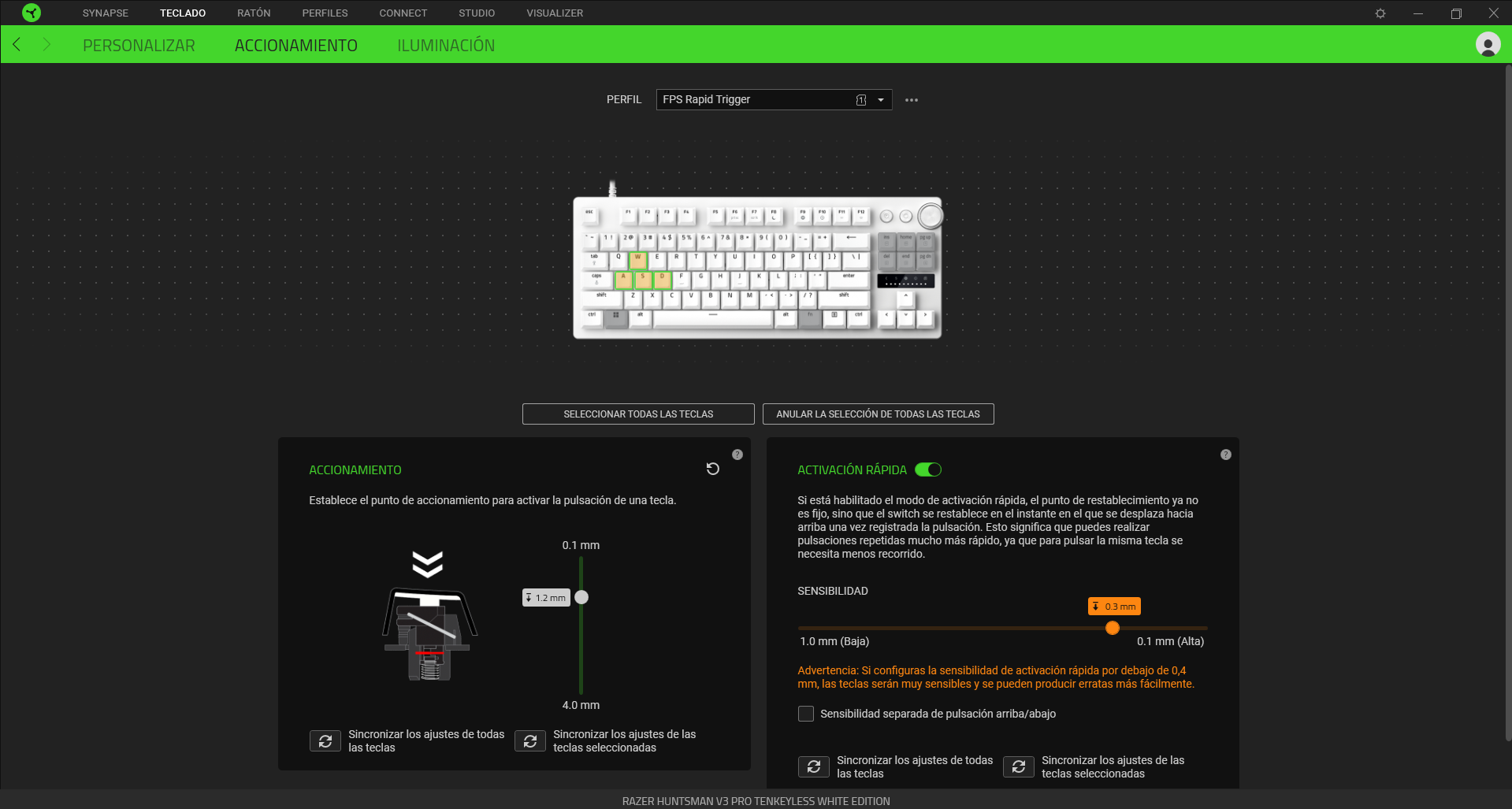 Pulsa FN + Caps Lk para modificar los ajustes de activación rápida y pulsa Caps Lk para activar o desactivar el modo de activación rápida. A continuación, pulsa cualquier tecla para verificar tus ajustes de activación rápida actuales y usa el dial digital o las teclas de flecha para realizar los ajustes pertinentes. Pulsa Esc para salir del modo y guardar tus ajustes en la memoria integrada.